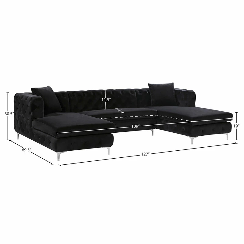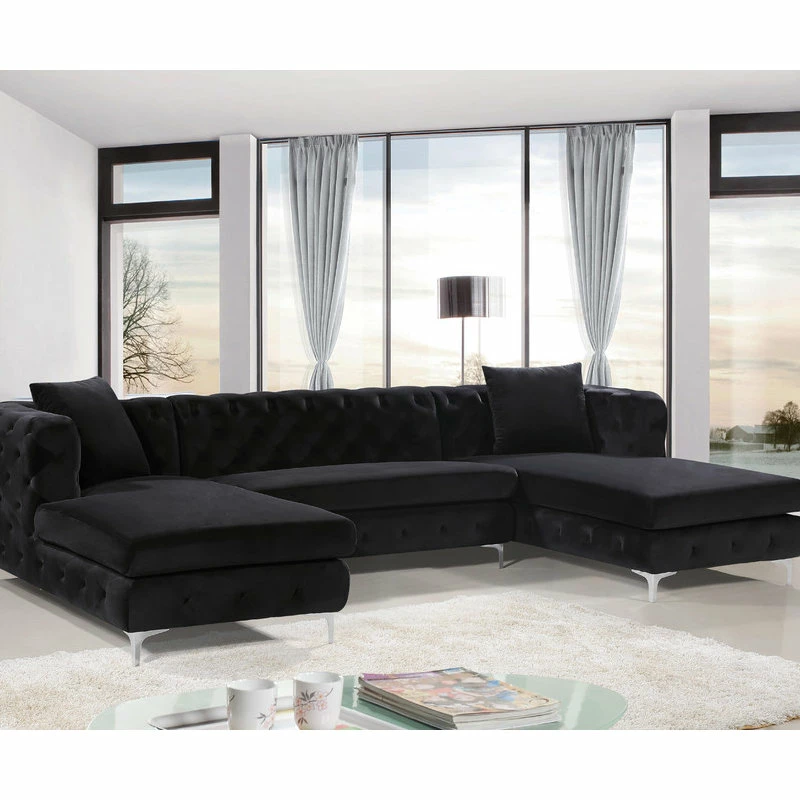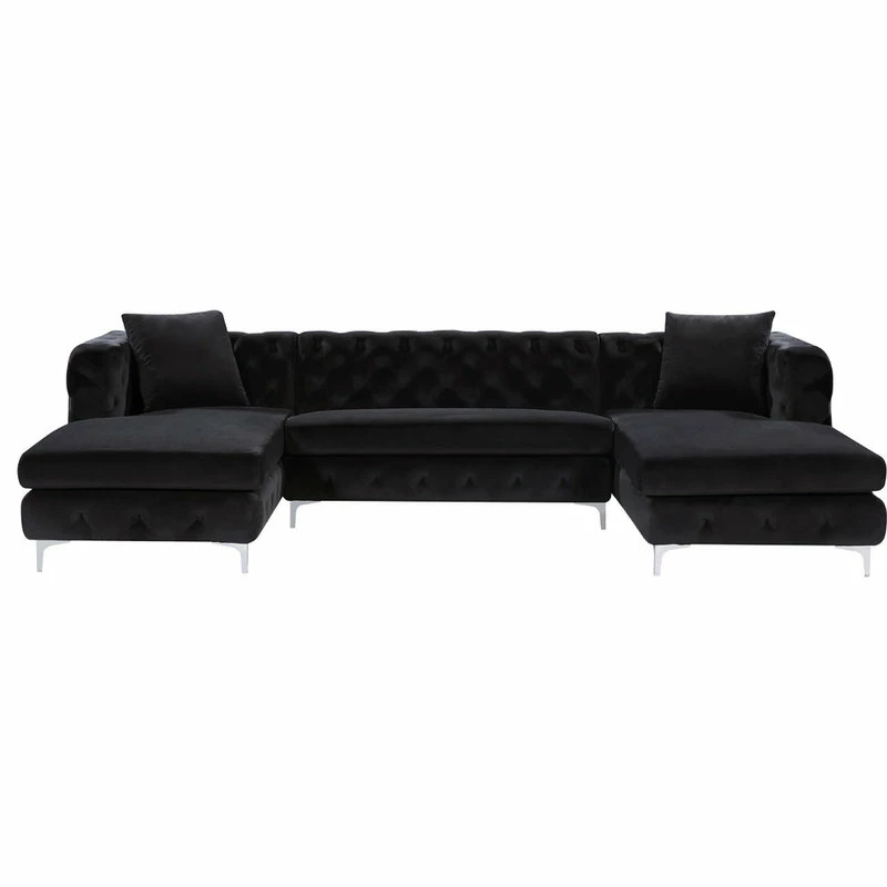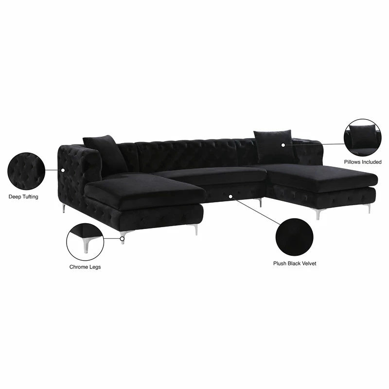 Bring fine living to the forefront with this Gail three-piece sectional. This black-colored sectional features two chaise ends, giving you the room you need to snuggle up and get comfortable on movie night. The upholstery is made from velvet and simply luxurious to the touch. Deep tufting all over the backs and sides of this unit add to its glamorous vibe, while the chromed legs finish off the design on a modern note. This sectional comes with pillows for added comfort and style.