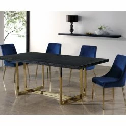 Extend contemporary panache to the dining room with this Karina Navy Velvet Dining Chair. This dining chair features upholstery in sleek navy velvet for a modern look and has an armless design for a retro-inspired vibe. The stark navy color makes it easy to blend in with your existing decor colors or make a contrasting statement with ease. The slanted legs of this chair are gold finished for added modernity and to provide reliable and durable support while you dine.