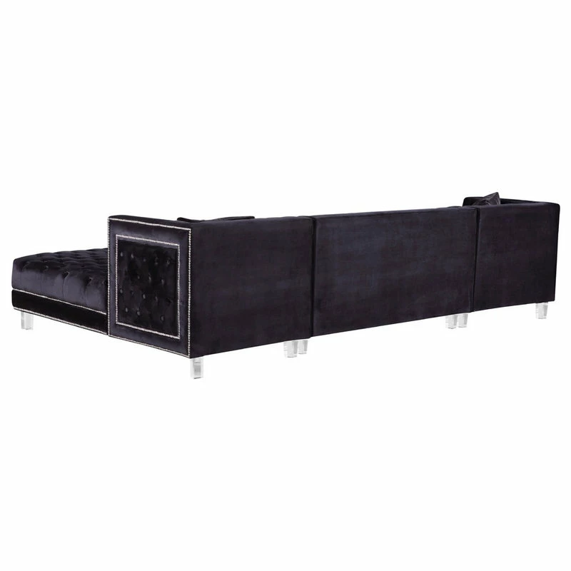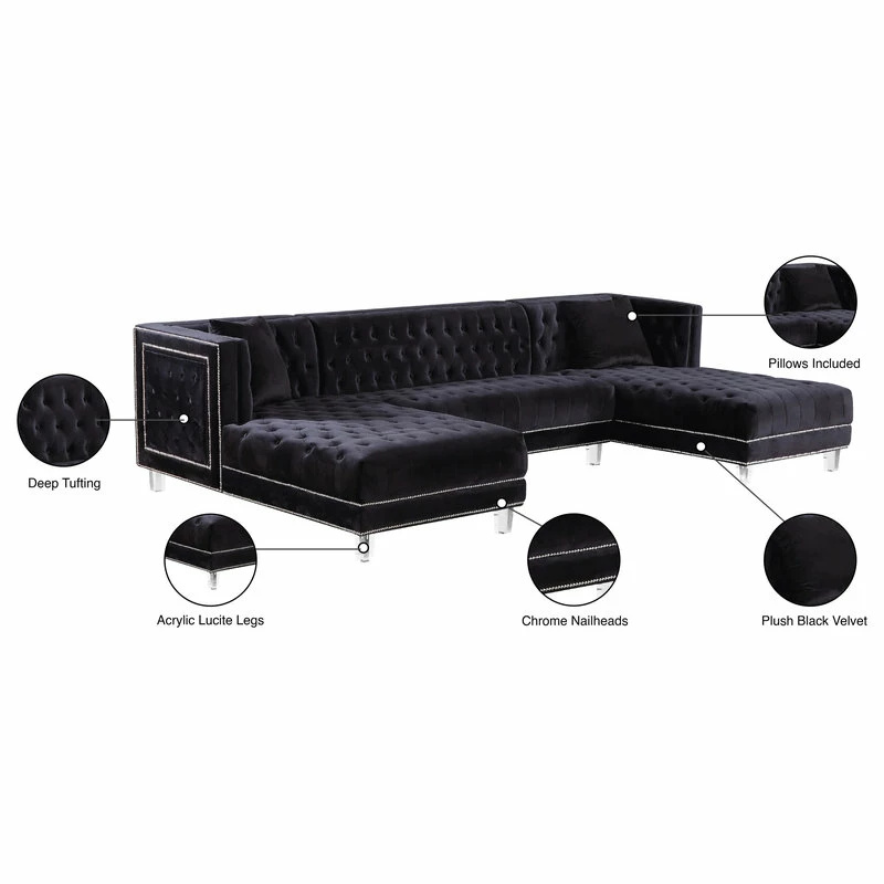 Designed with the utmost attention to detail and superior craftsmanship, the Moda 3-Piece Velvet Sectional adds an effortless twist to your modern living space. Including double chaise lounges on each end, this sectional encourages stretching out and getting comfortable for a movie night in with friends or the whole family. With its rich tufting and elegant detailing, this 3-piece sectional is the eptiome of luxury to complete any modern day home. Its base is also crafted with acrylic lucite legs and a strong frame providing stability for its users. Its pillows included that are pictured encourage contemporary comfort that compliment its sleek design.