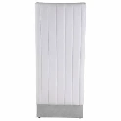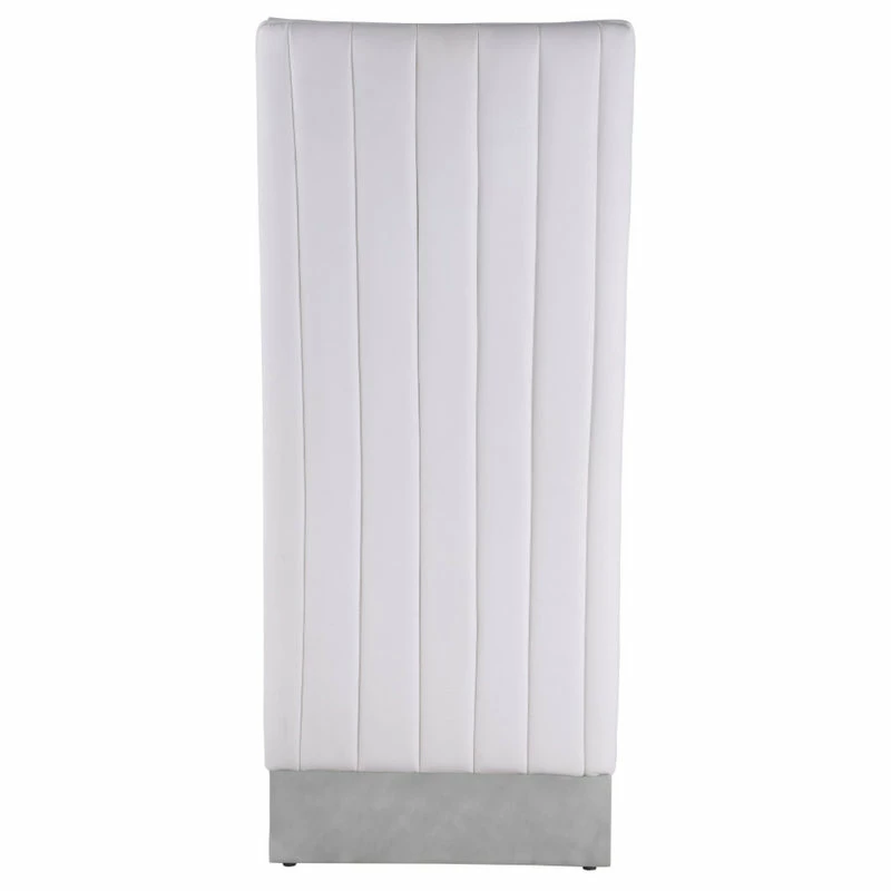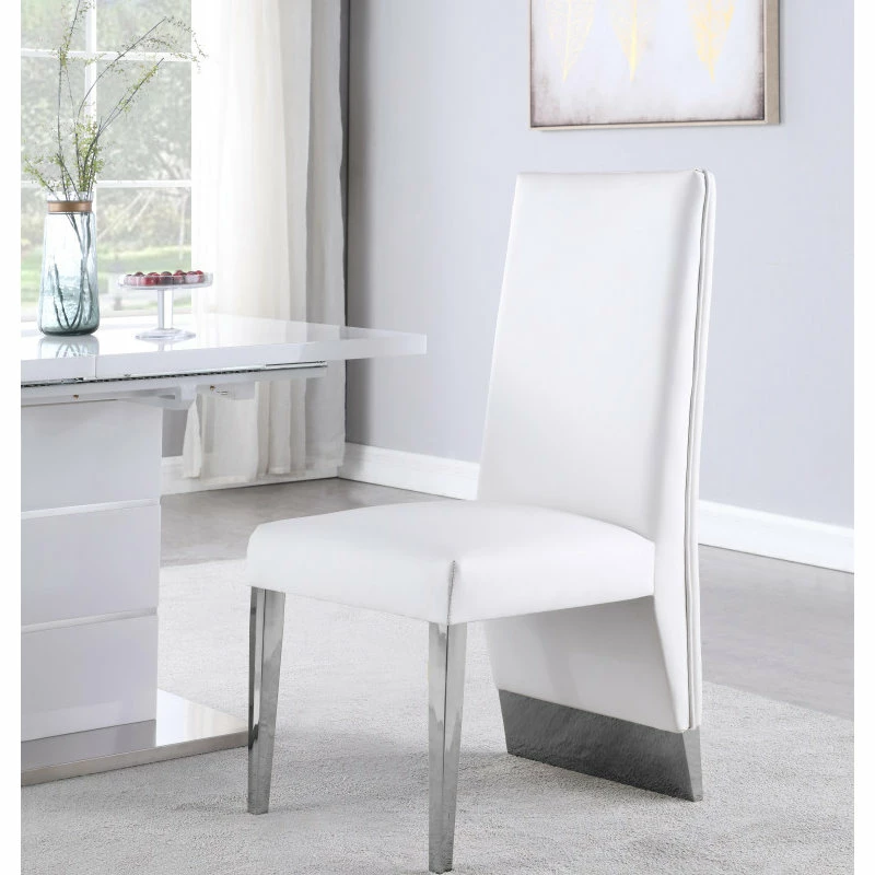 Bring the luxe look of this Porsha chair to your dining space. Impressing guests is simple when they’re seated in this chair. The floor-length back is elegantly beautiful and creates a striking silhouette from every angle. Faux Leather upholstery material in a sophisticated hue of white adds a touch of modernity to this chair, and the reverse is channel tufted for added elegance and refinement. Chrome legs complete the look for added contemporary panache and sturdy support.
