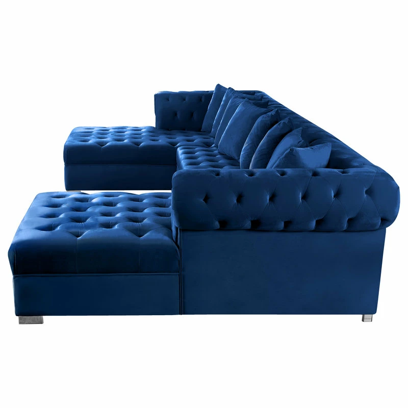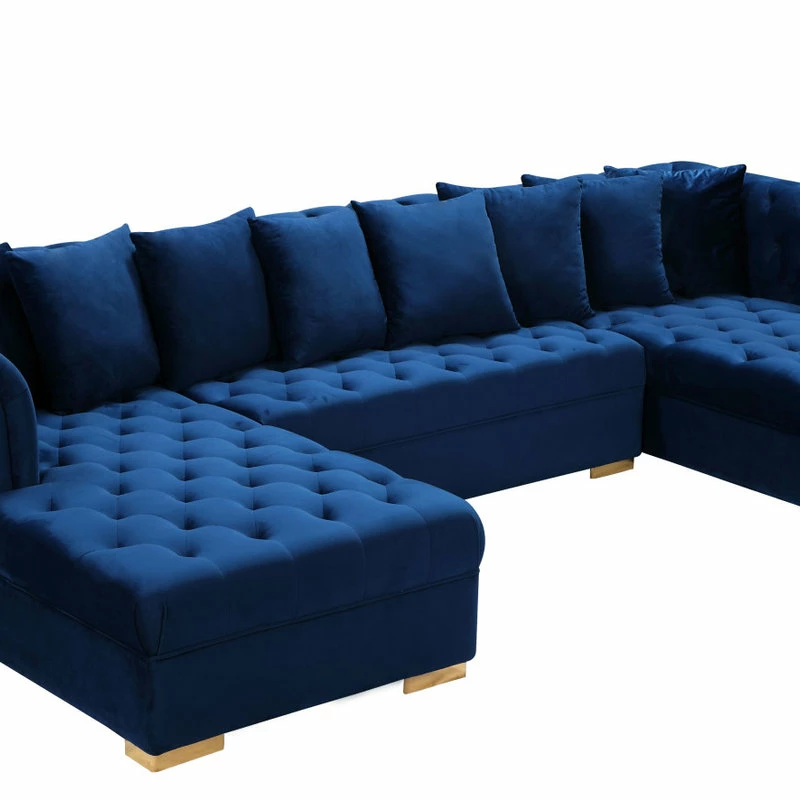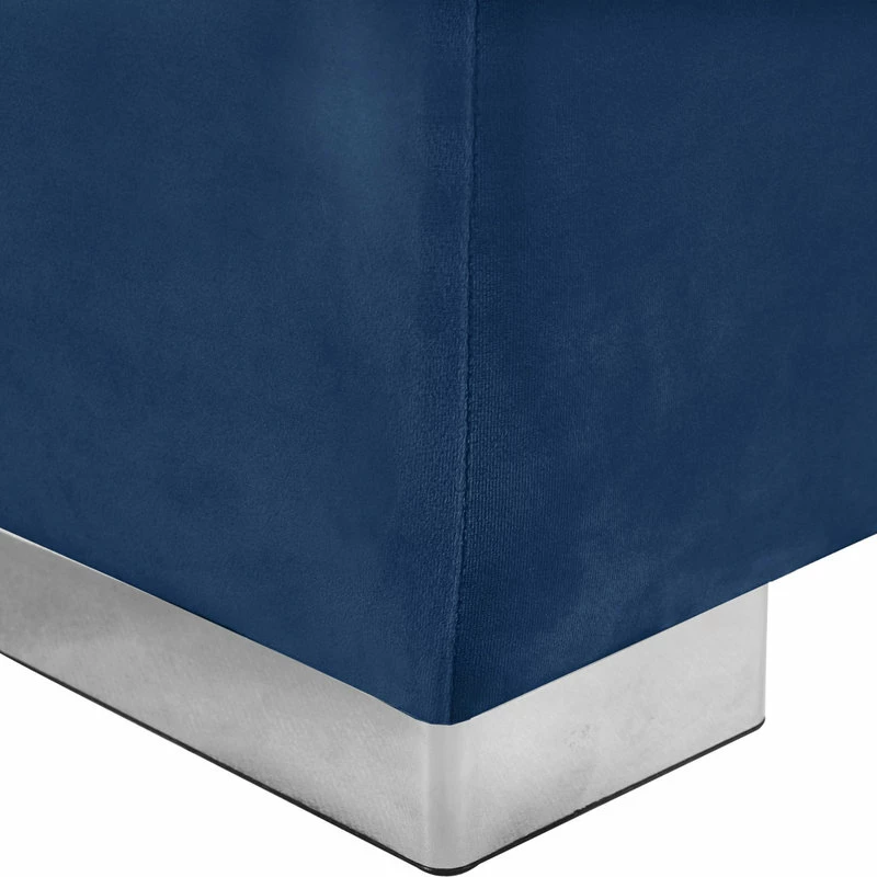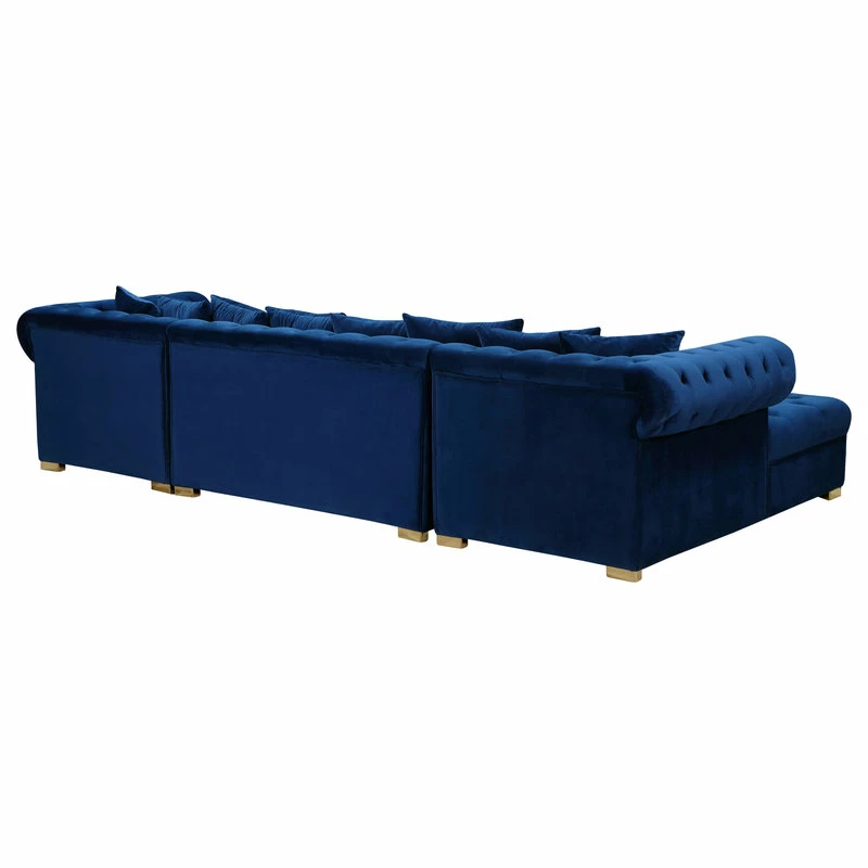 Get ready to relax after a long day with this Presley Navy Velvet 3pc. Sectional from Meridian Furniture. Featuring rich navy velvet upholstery with deep tufting and comfy pillows, this double chaise sectional provides a luxurious, cozy space to kick back and watch TV, take a nap, or curl up with a nice book. Complete sets of gold and chrome legs complement your contemporary home décor while providing solid support for the sectional’s frame.