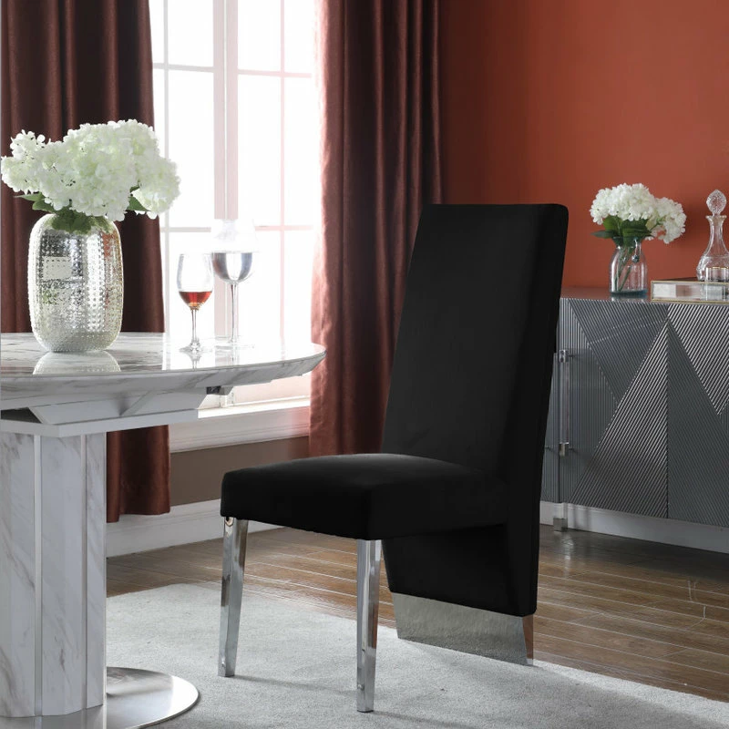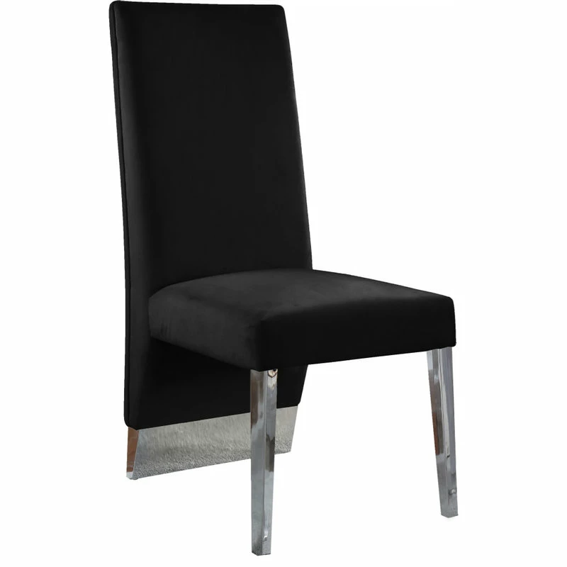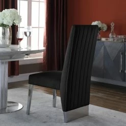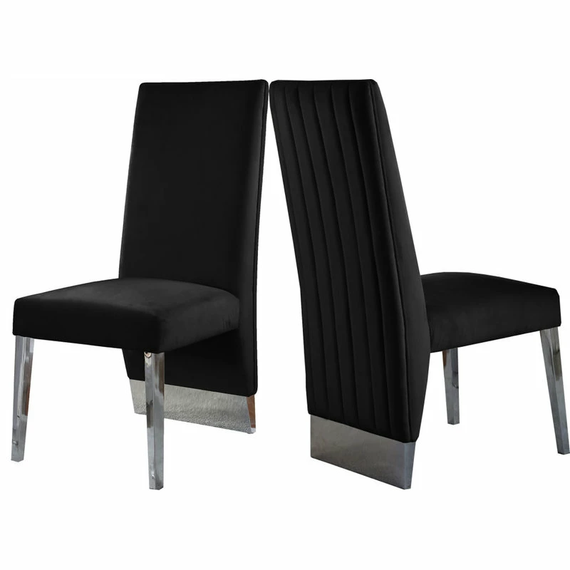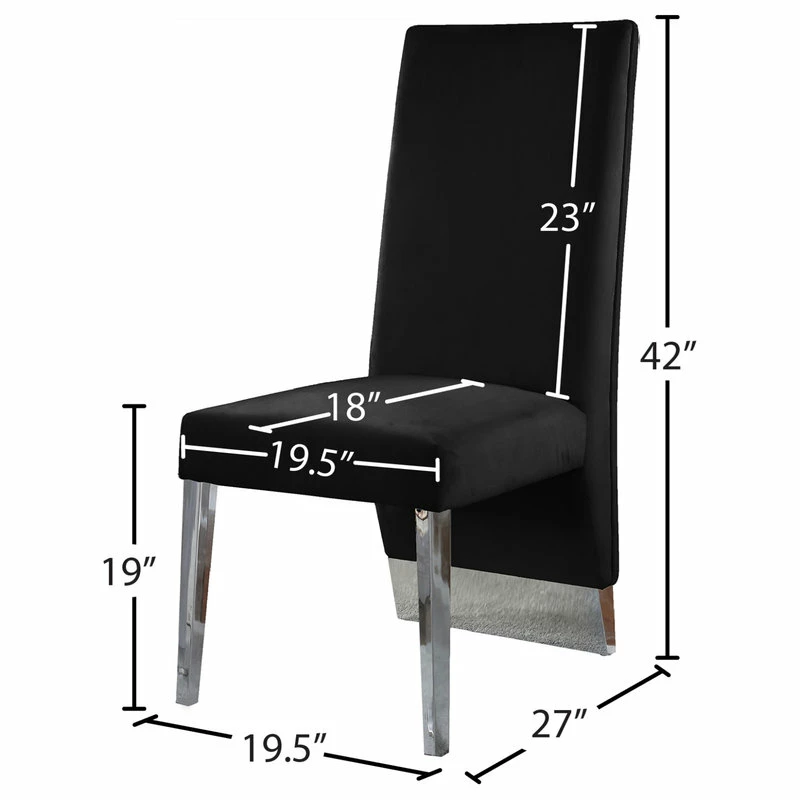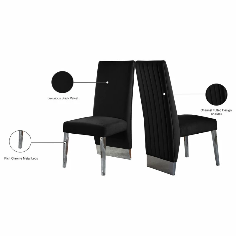 SKU: 756Black-C Category: Dining Chairs Tags: Black, Channel tufted design on back, Chrome, Comfortable, Contemporary, Dining chair, Luxurious, Luxurious black velvet, Meridian furniture, Modern, Nice, Porsha, Porsha black velvet dining chair, Rich chrome metal legs, Set of 2, Sturdy, Velvet