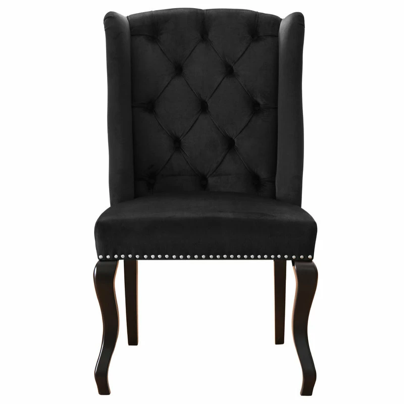 Want to feel like royalty? Pull up the Florence. Its high-winged back with deep tufting makes this traditional chair a dining room staple. Chrome nailheads outline its velvet-wrapped silhouette for a luxurious, elevated look. Sturdy wooden legs support the seat, and if you look closely, you’ll notice a slight s-curve on the front two legs that adds a subtle touch of elegance. A handle on the back adds to both the form and function of this delightful piece and entices guests to pull up a seat and stay a while.