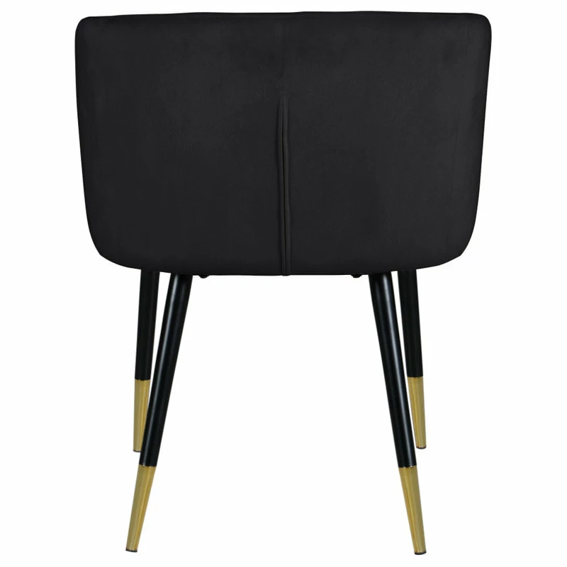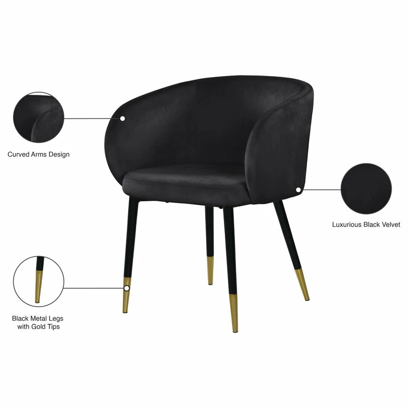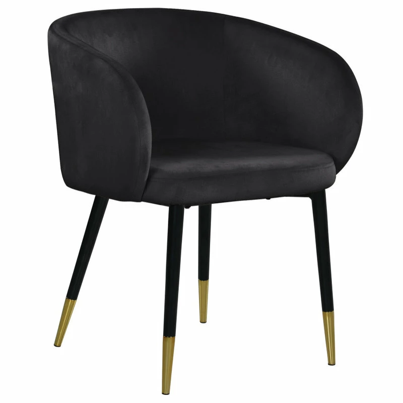 Bring home your new throne with the stylish Soho. Covered in lush velvet, this contemporary dining chair is as comfortable as it is durable. Elegant metal legs in black stretch down to gold-finished tips that accentuate any flooring. Guests will fall in love with its curved back and sides that envelope you in almost all-around cushioning. Sink into the Soho and you’ll find that no matter where you place it, luxury will be at the forefront.