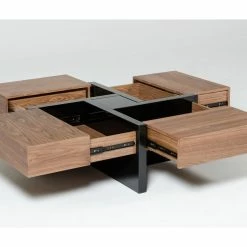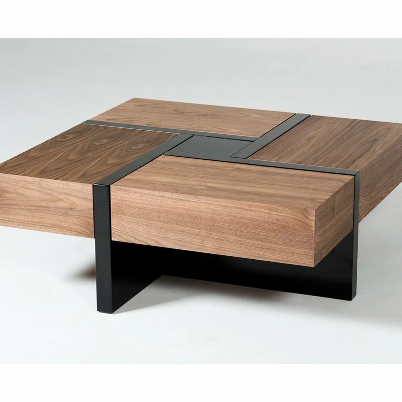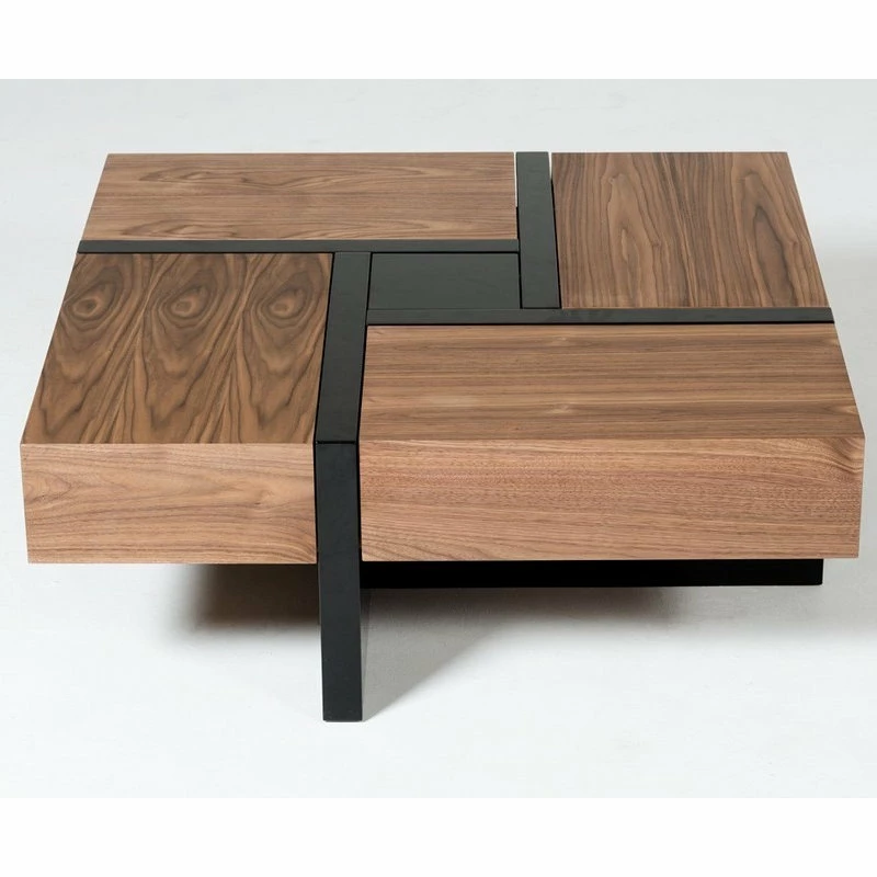 Enhance the functional appeal of your living room with the Modrest Makai Modern Walnut & Black Square Coffee Table featuring a Walnut Veneer & Black high gloss finish. The surface with wood grains imitates a puzzle design that reveals 4 soft-closing drawers, a magnificent display of brilliant artistry.