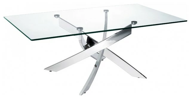 The Modrest Pyrite Modern Glass Coffee Table features a voguish appeal with a 10mm clear glass top and an interlace-designed glossy chrome base. Other Pyrite collection items are available and sold separately.