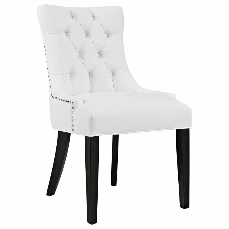 Transport your decor to a simpler time with the Regent Dining Side Chair. Fashioned with a chic and elegant look, Regent features finely tufted buttons, studded nailhead trim, and a regal seat generously padded in foam and upholstered in vinyl. Regent comes with non-marking foot caps, tapered wood legs, and works well in both modern and traditional dining rooms.