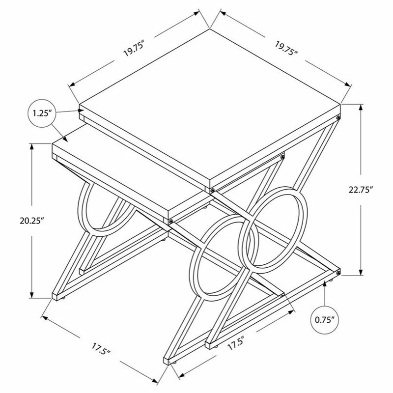 This set of 2 contemporary style nesting tables bring fashion and function to your living space. The thick glossy white square tabletop is spacious enough to hold a lamp, pictures, drinks or snacks. The chrome metal base with a unique circle intersected by an X leg design gives a statement appeal while providing solid support. This multi-functional table set is neatly stored one under the other for a space saving solution, and can be used as end tables or simply pulled out as snack tables when entertaining. The classic lines of these nesting tables will suit most decors. Assembly is required.