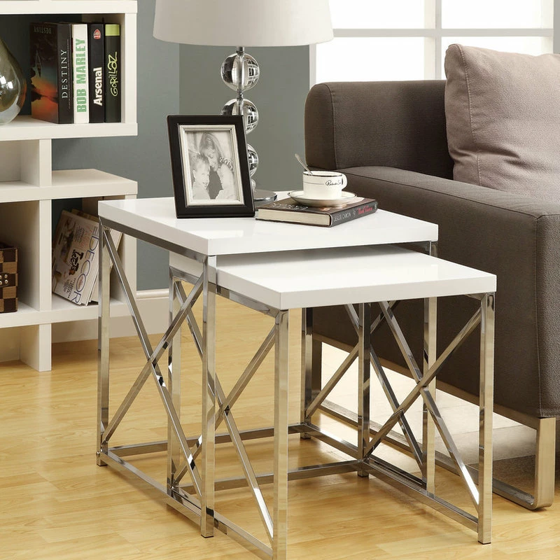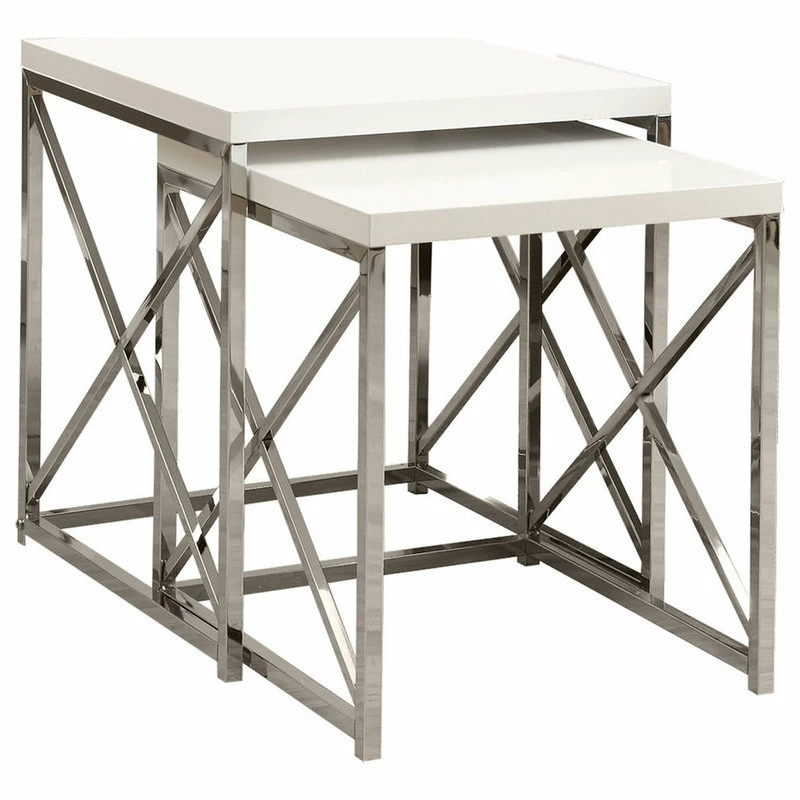 By playing with line, form and color, the 2-Piece Nesting table Set provides a fresh burst of energy for any space. With a criss-cross chrome metal base for support, white surface and thick paneled designed, the table brings a modern edge. Use the Nesting Table for holding lamps or providing a surface for decorative accent pieces.