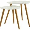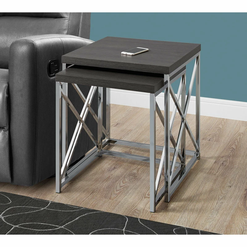 By playing with line, form and color, the 2-Piece Nesting table Set provides a fresh burst of energy for any space. With a criss-cross chrome metal base for support, gray surface and thick paneled designed, the table brings a modern edge. Use the Nesting Table for holding lamps or providing a surface for decorative accent pieces.