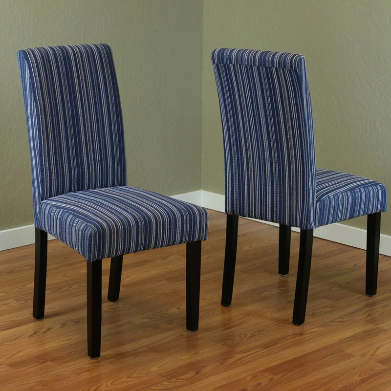 Wine and dine in the trendy high back design of the Seville Stripe Dining Chairs. Sold as a set of 2, these transitional seats will complement your dining room table and provide a comfortable spot to sit in for hours. Crafted of durable wood and upholstered in stripped linen, the Seville Stripe Dining Chairs are guaranteed to create a chic flair that will enhance your everyday style.