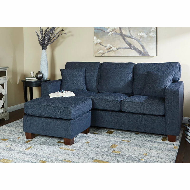 - Convenient reversible chaise Two decorative matching pillows Tapered block legs Easy assembly