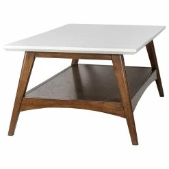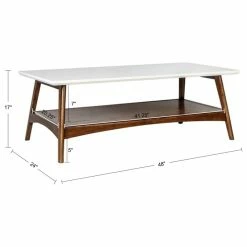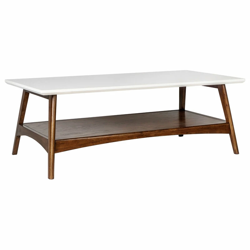Add the bold Madison Park Parker Coffee Table to your living space. This all-wooden mid-century inspired coffee table will go nicely with your living room decor. It features a wood finish tabletop composed from manufactured wood, a solid wood frame, and a bottom shelf for extra storage space. The two-tone gives this table a striking contrast.