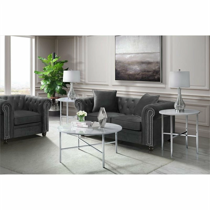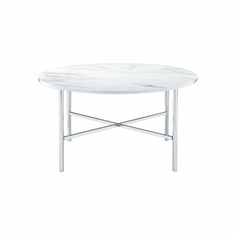The Picket House Furnishings Zara 3PC Occasional Table Set is a must have piece for your living area. Glam begins here, with one coffee table and two end tables in this set. The tables showcase sleek chrome metal legs and a faux marble top. The round shape of the table top and the cross base provide quality stability of this piece. Add a mirrored lamp to the end tables, so the beauty of this set and shine through. Also, the chrome legs will shine against any flooring color and provide that kiss of glam in your space. Turn the lights on and let this glam set shine!