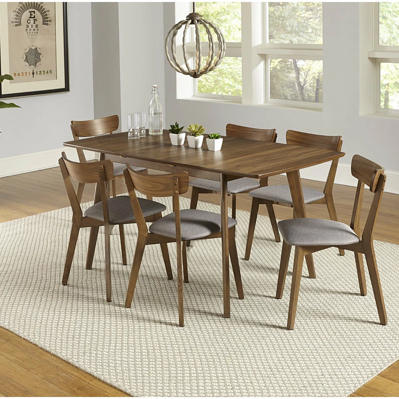 The Chairs are Rubberwood with gray upholstered seats. Warm Walnut finished frame. Simple line design creates a clean look.