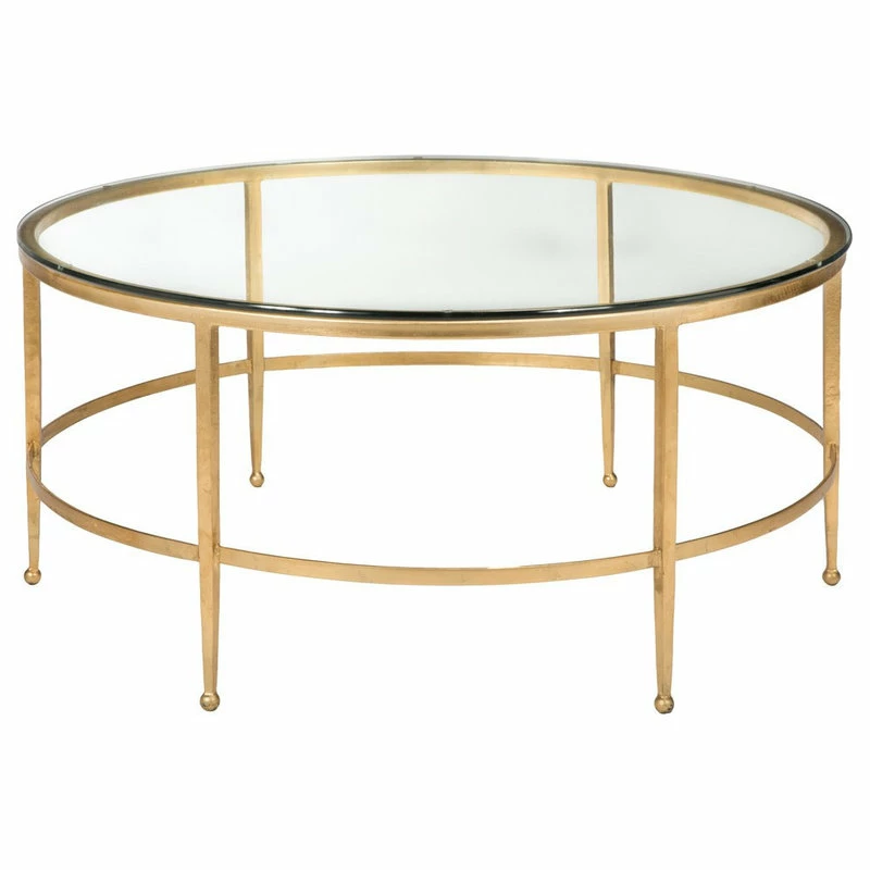 The strikingly simple geometric form of the Edmund Round Cocktail Table also has a practical side. With no sharp edges, It’s an elegant look for a home with children, and it works beautifully with an array of sofa choices. Crafted of metal with antique gold gilt finish, the Edmund table is topped with glass.