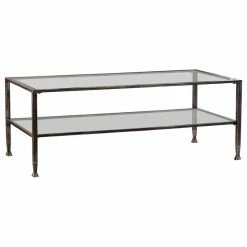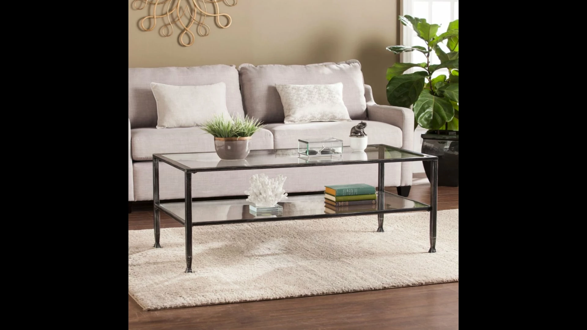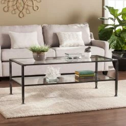 Minimalism marks the spot with this simply chic metal and glass cocktail table. Distressed black rectangular frame houses shatter resistant tempered glass shelf and tabletop, crafting a shadowbox effect. Wide open architecture shows off your conversation