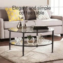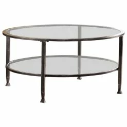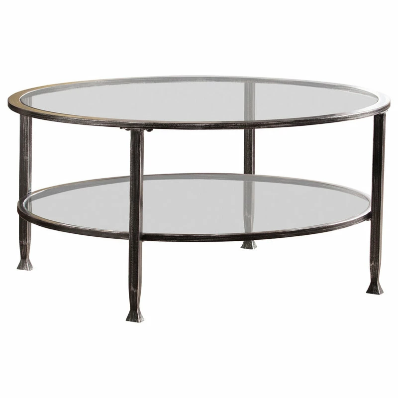 Round out your d_cor with this distressed black metal and glass cocktail table. Simple circular shape holds tempered glass tabletop and shelf, crafting a slight shadowbox effect; open architecture easily displays tchotchkes or basket storage. Instill cont