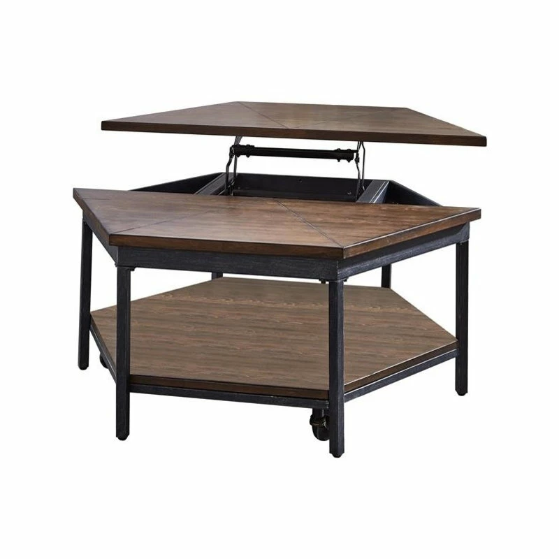 The Ultimo Cocktail Table is crafted from stylish mixed media and features a lift-top and casters easy mobility. An interesting hexagonal shape is accented by a stylish veneer design on the top. The mocha finish and iron base add style and functionality to this design.