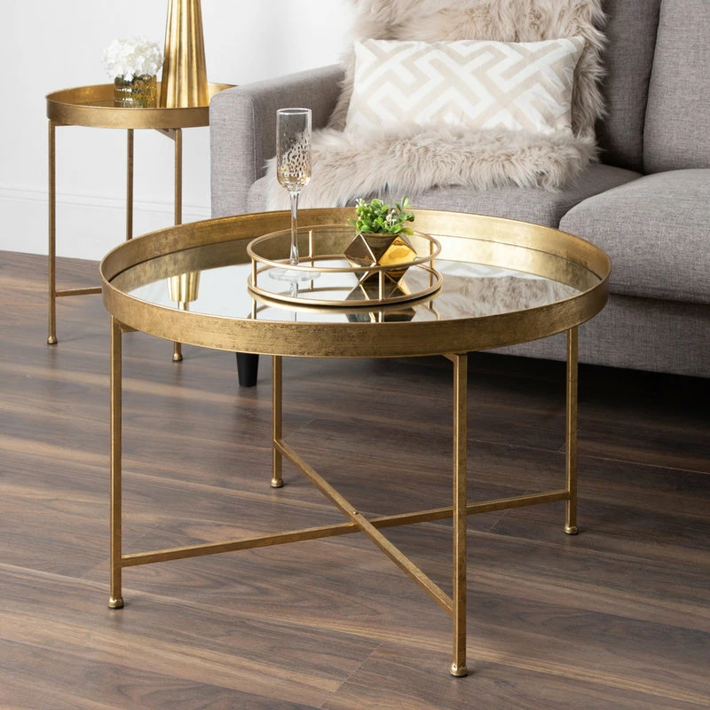 - The Celia Coffee Table’s sophisticated mirror tray surface and gold leaf finish is both luxurious and simple, offering a touch of elegance with functionality in a modern glam style
