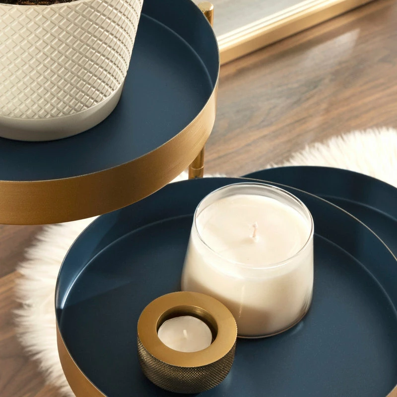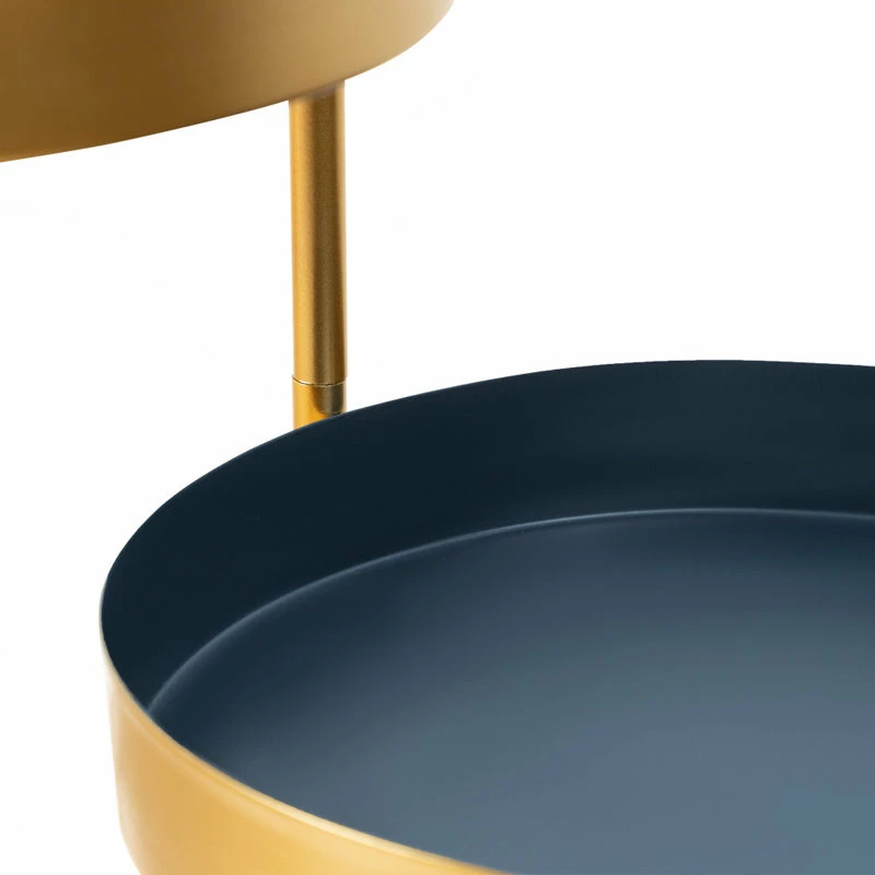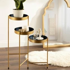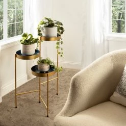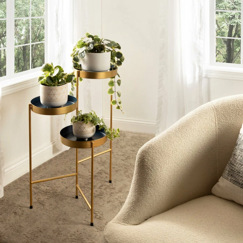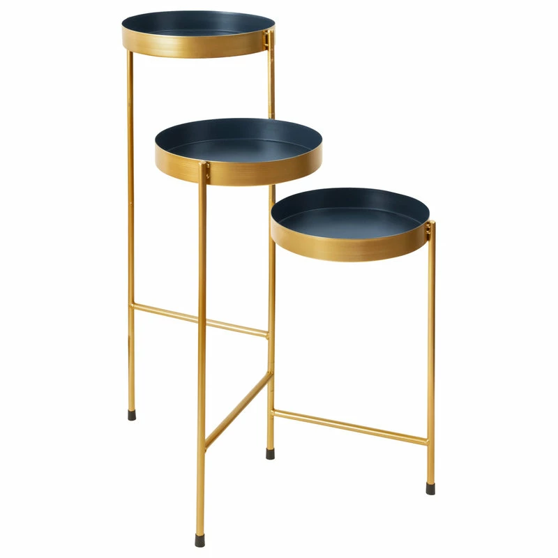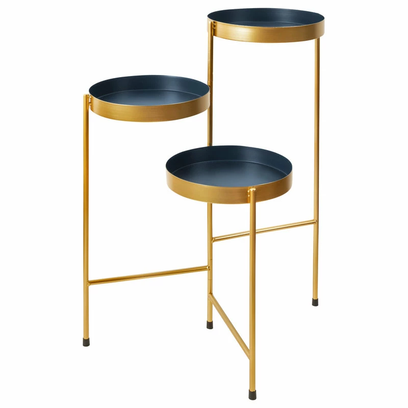 Showcase decor elements like photos, keepsakes, and plants with the modern Finn tri-level plant stand. The graceful triple-tiered design, durable metal frame, and beautiful round trays create the perfect combination of function and decoration. The three planter trays are 10 inches in diameter and will comfortably fit an average plant pot. It doesn’t have to be potted plants, either! Display anything from decorative orbs, pictures, ornate miniature clocks, and more in one of the three trays. The Finn planter is suitable for any room in your home, including your living room, bedroom, office, or bathroom. The smart build features three graduated shelves with hinged legs allowing you to arrange to your satisfaction and enable secure storage. The dimensions are 30 inches tall for the top planter tray, 24 inches tall for the mid-tiered planter tray, and 18 inches tall for the lowest planter tray. Add a modern touch to your home with the navy and gold Finn plant stand.