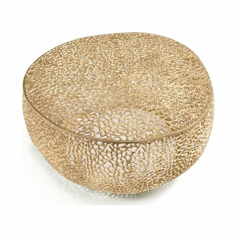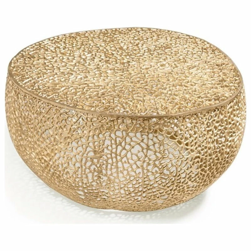 Coffee table with an unique contemporary gold circular design with a cellular, organic coral pattern. A fun coffee table with a flat top surface to place your favourite decor on, the unique pattern goes around the sides.