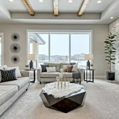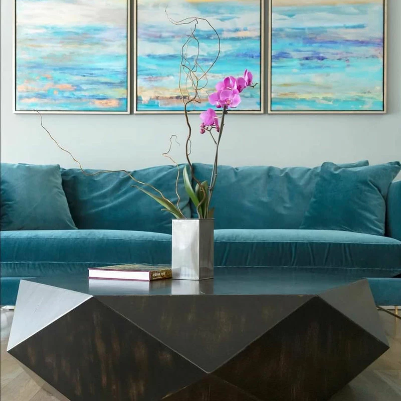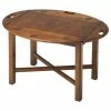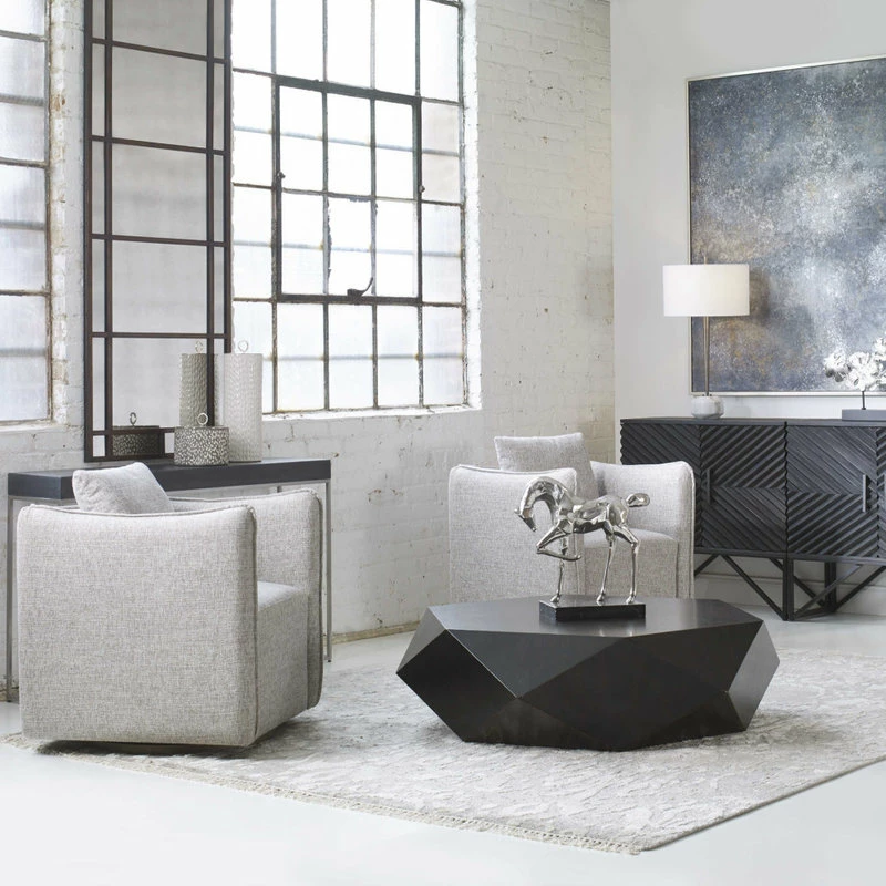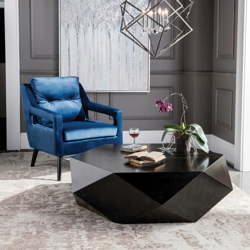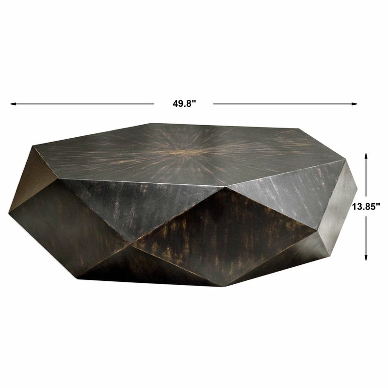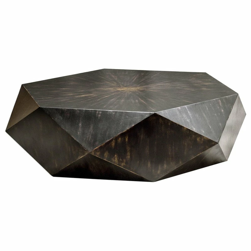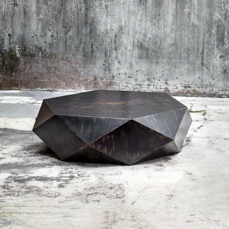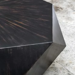 This unique geometric table features a low profile, perfect for viewing the sunburst top in mango veneer with a worn black finish rubbed to reveal honey undertones.