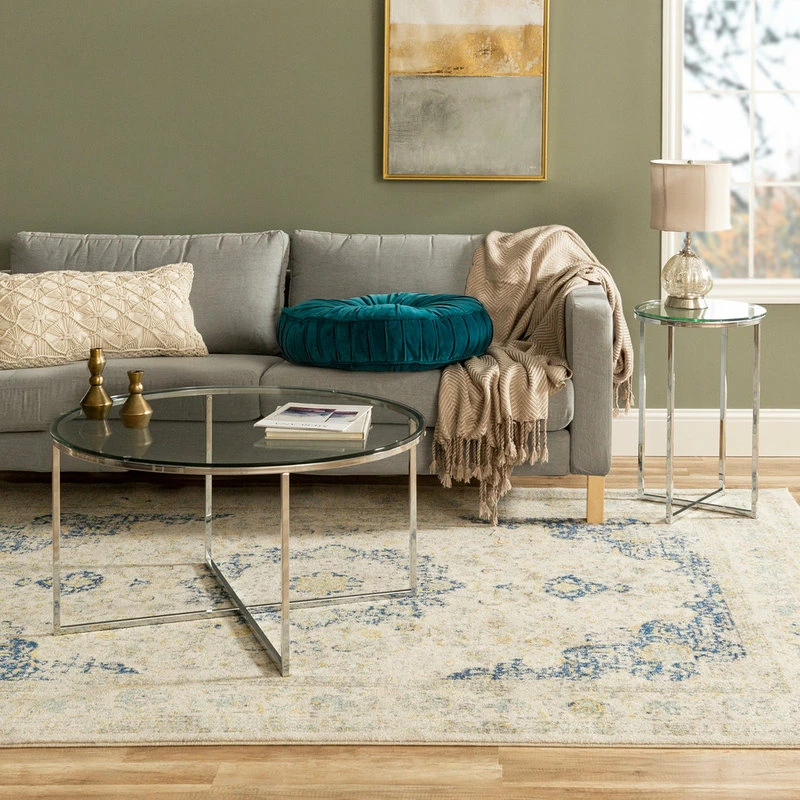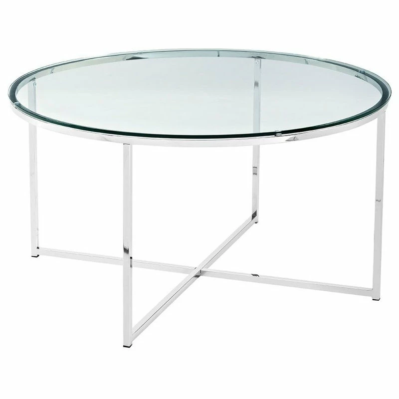 Complete your living room with this matching, 2-piece round coffee table set. Featuring a side table and coffee table of the same x-base design and modern style to complement your space. Each showcasing painted, chrome metal legs and a round, tempered safety glass table top. Set the coffee table and side table in front and beside your sofa to display decor and keep books, TV remotes, and a reading lamp. You can also use the side table as a nightstand in your bedroom if you’d like to exude a modern design style throughout your home. This set includes a coffee table and side table.
