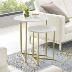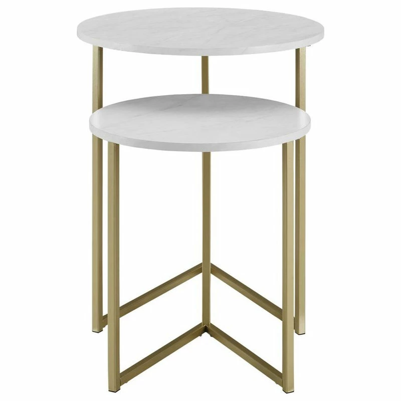 Point your style in the right direction with these V-leg nesting side tables. The dynamic metal legs are made of powder coated metal while the table top is constructed out of warp-resistant MDF and finished with a high-quality laminate. Glam design gets a geometric update with these two-tone, angled accent tables. Flexibly use these nesting tables together or separately.