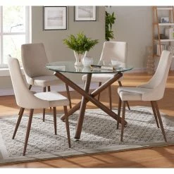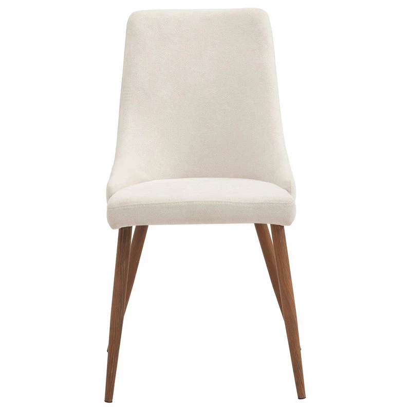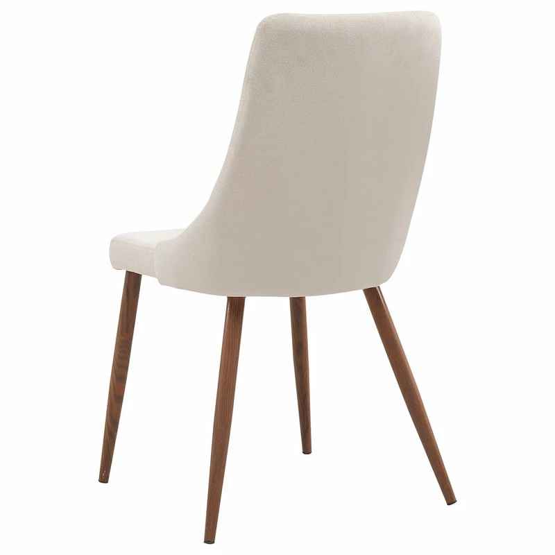 The oblate, tapered legs and minimalist, beige upholstery of the set of two mid century Modern Upholstered Dining Chairs merge twentieth-century design with contemporary trends. The padded, comfortable seat is supported by metal legs, which sport a heat-transferred, walnut finish to give them a Scandinavian look. The dining chair set’s neutral colours and quietly edgy style add an air of sophistication to dinners with friends and cocktail nights with colleagues.