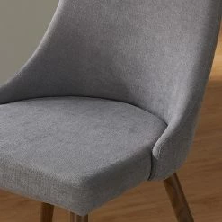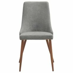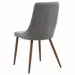 The oblate, tapered legs and minimalist, gray upholstery of the set of two mid century Modern Upholstered Dining Chairs merge twentieth-century design with contemporary trends. The padded, comfortable seat is supported by metal legs, which sport a heat-transferred, walnut finish to give them a Scandinavian look. The dining chair set’s neutral colours and quietly edgy style add an air of sophistication to dinners with friends and cocktail nights with colleagues.