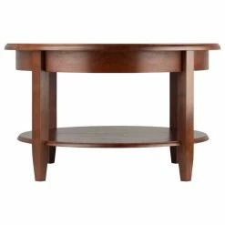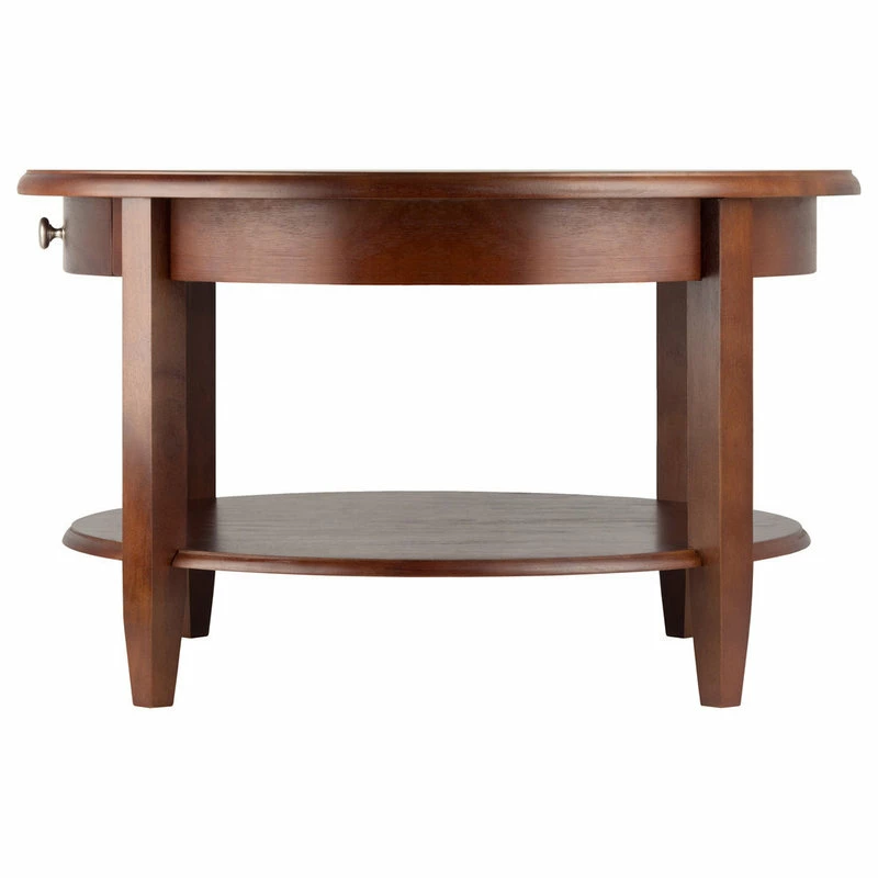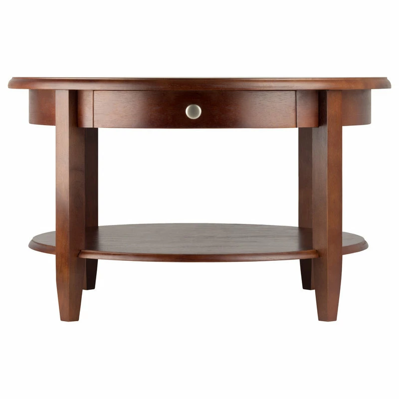 Beautiful walnut finish round Coffee Table with tapered legs. Drawer has satin nickel knob, shelf for storing decor. Match with Coffee Table# 94231, Half moon Hall Table#94039 or # 94132 collection.Features