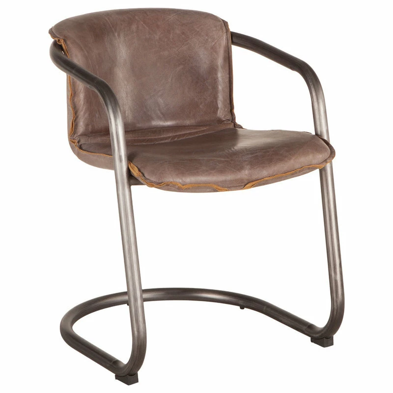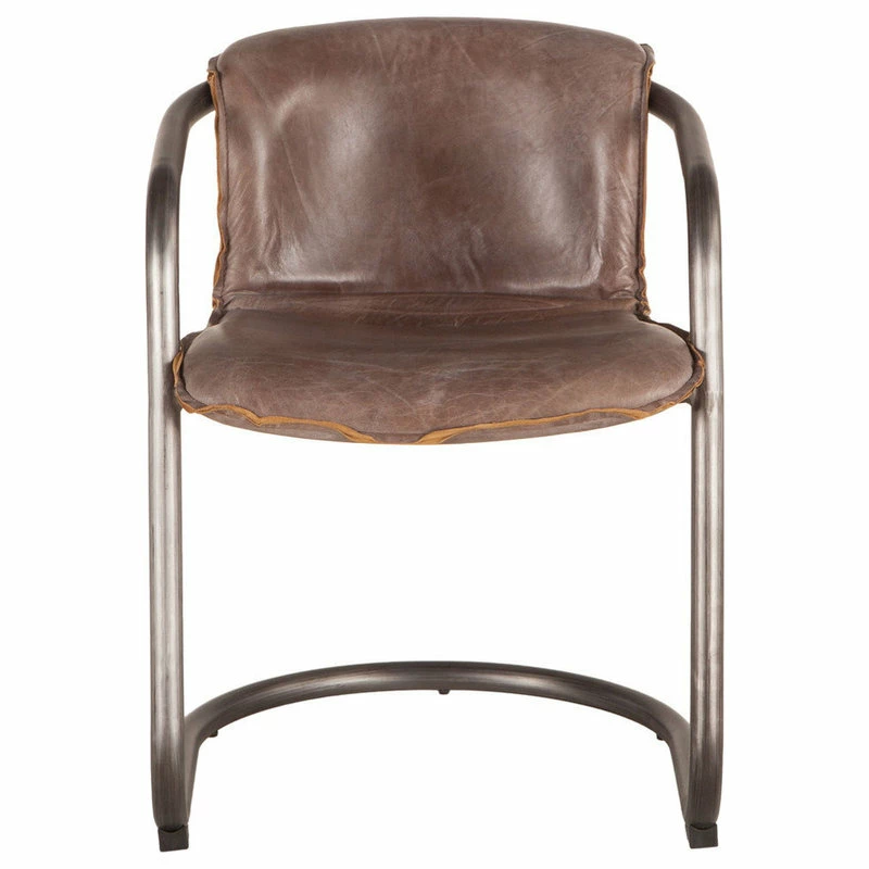 Our Chiavari collection of retro-inspired chairs and sofas will add vintage charm to your dining room, kitchen, or living room. The distressed jet brown leather seat has a soft feel for ultimate comfort, while the exposed trim provides vintage flair. The U-shaped steel frame and legs in rustic, brushed gunmetal finish includes levelers with caps to protect all types of flooring. Combine with your favorite dining or kitchen table for a casual dining space, pair with a modern desk for a stylish work space, or adjoin with a side table for a comfortable cocktail and reading nook. This pre-assembled dining chair is ready-to-use and of the finest quality, and with its classic design and elegance, it will make an effortless addition to any home.