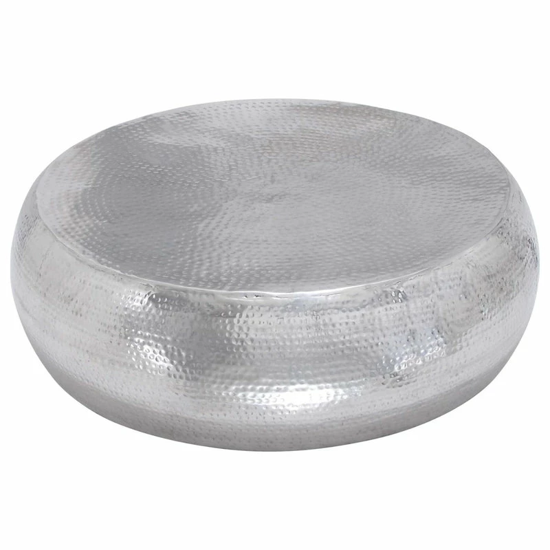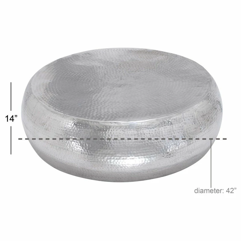 Bold, contemporary-styled round coffee table made from 95% aluminum and 5% iron. Hammered metal offers rich texture and dimension throughout the round body and top of this silver coffee table. Simple modern shape works in almost any space, and the lightweight aluminum makes this stylish metal coffee table easy to move around.