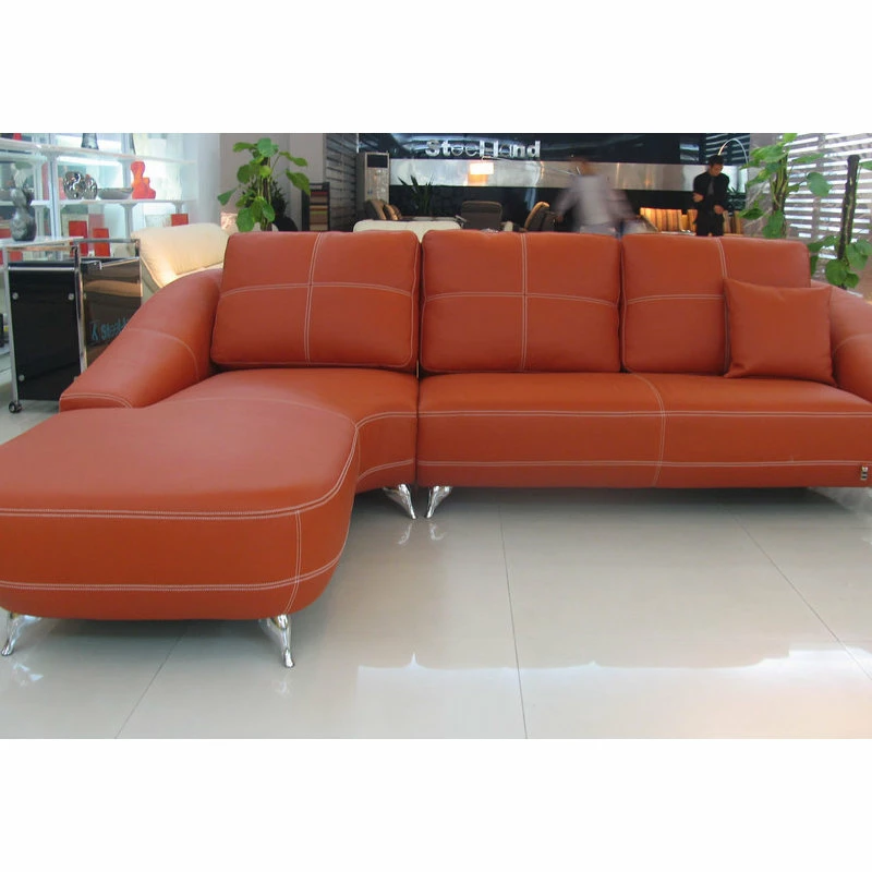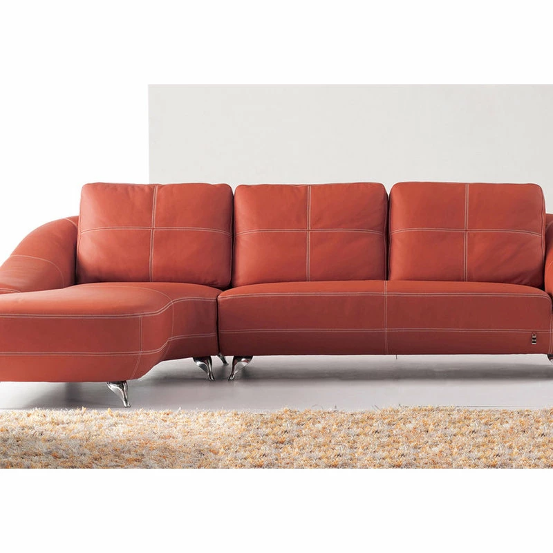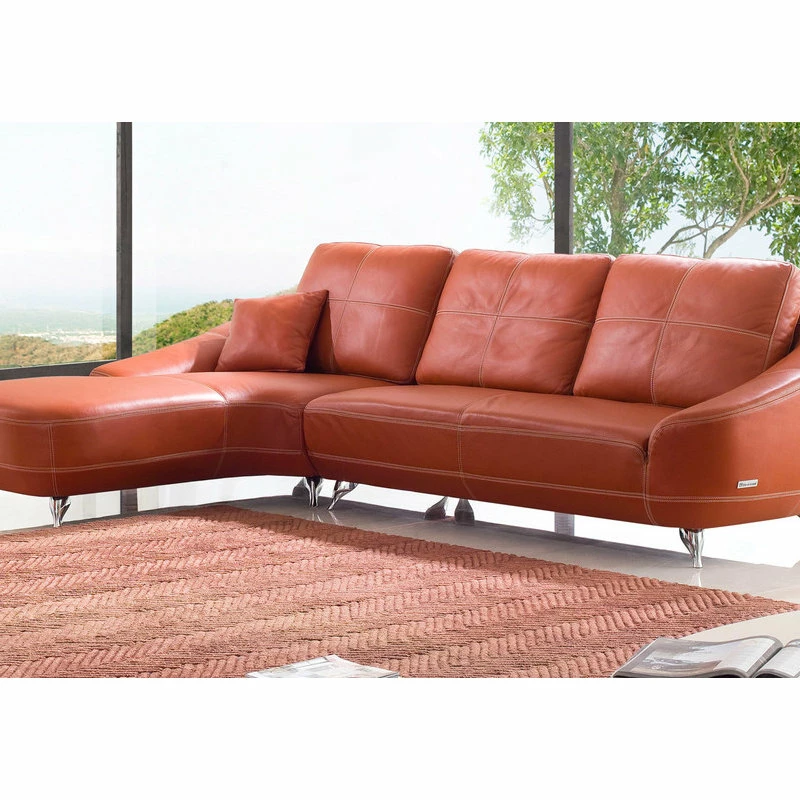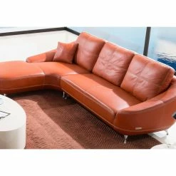 A fabulous balance of contemporary and retro styling, our Lucy sectional delivers social poise and grace in refined abundance. Soft high density foam seating combines with premium contrast off-white double top-stitching and genuine top grain Italian leather, creating an indulgent retreat. The rich, burnt orange color will warm any living room up with legendary results. Top if off with sculptural chrome legs and you have a spectacular piece that is sure to turn everyone’s heads! Includes one matching throw pillow.