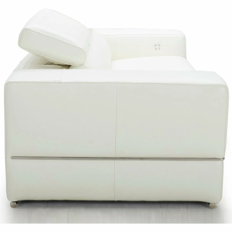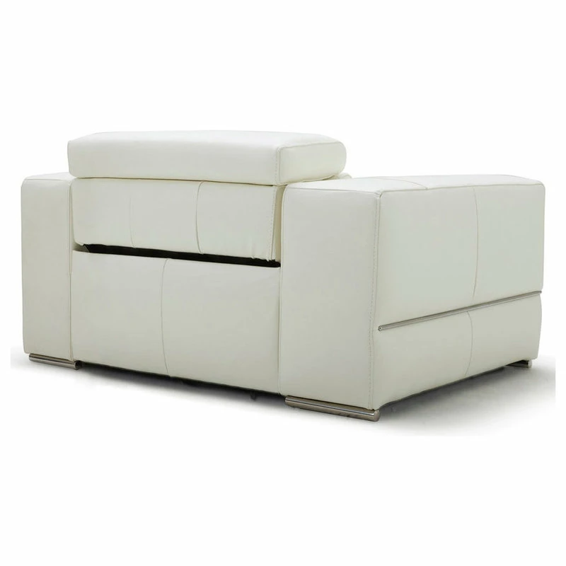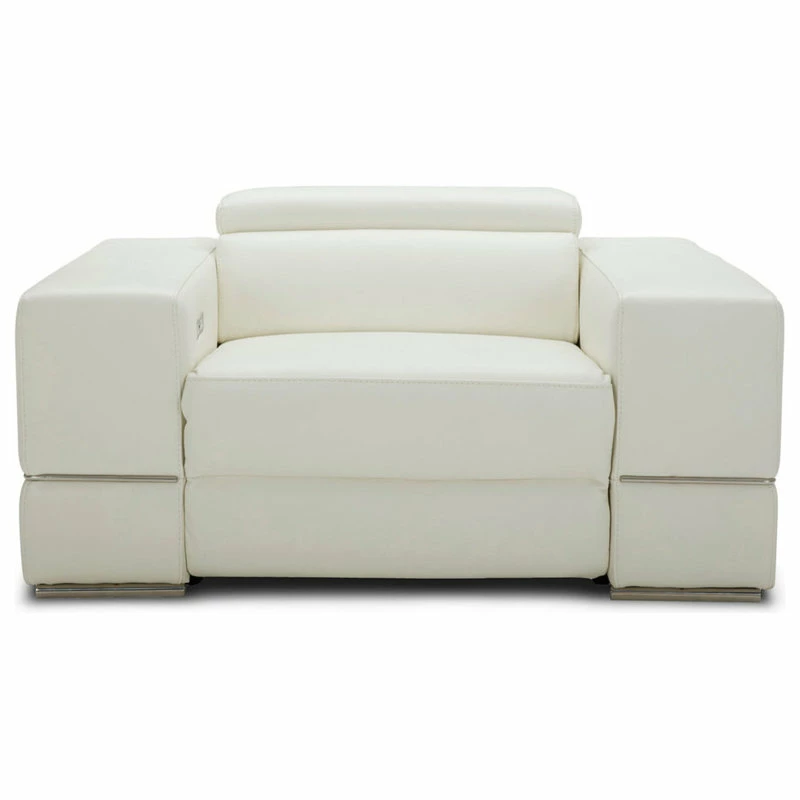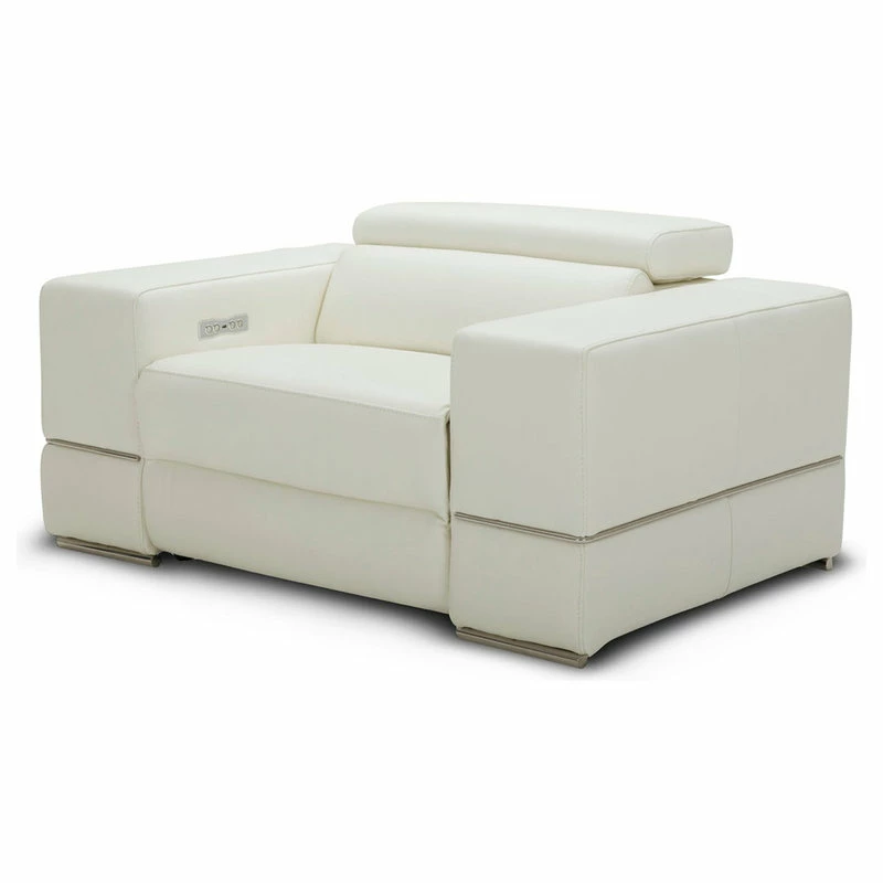 When it comes to recliners, the Luxor is a beacon of comfort and contemporary leisure. Beneath the solid design is the fluid-like motion of a power recliner and adjustable headrest that make for a smoother than butter transition. The power mechanism is a series of 4 polished nickel touch buttons located on the outer armrest that control both the footrest and headrest independently. It also includes a bonus USB port charger. The Luxor sofa is resplendent in white, slate or black top grain leather with a genuine split leather match on the back and sides. The design is accented with polished stainless steel tubular feet and accents on the armrests. Get ready to kick back and enjoy an evening of relaxation with Luxor reclining chair. Buy two or pair it with the matching Luxor Reclining Sofa for a whole new world of comfort in your living room.