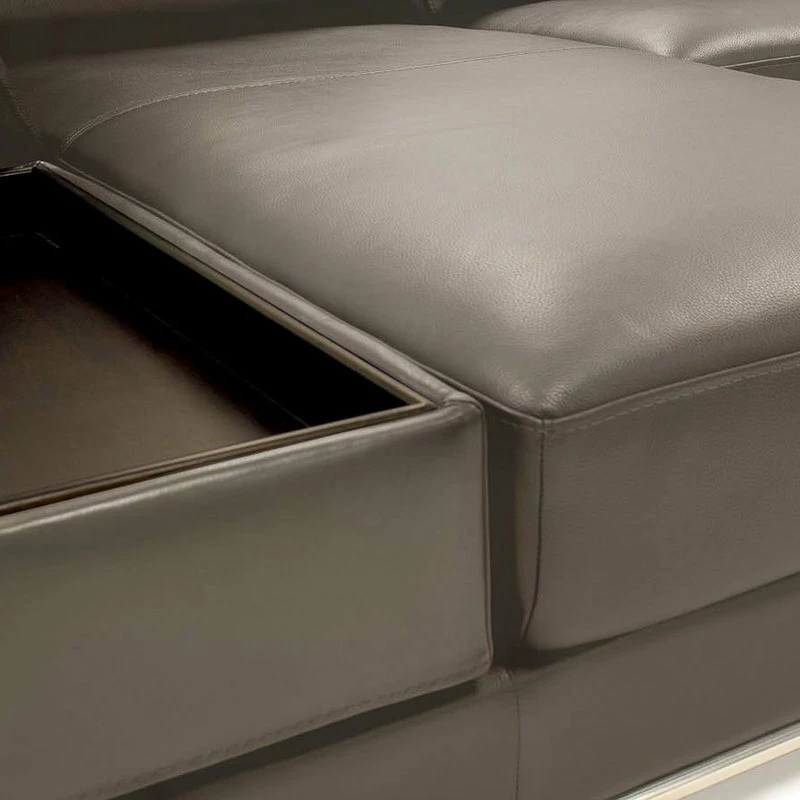 Elegant and Metropolitan, our Wynn sectional in top grain leather with genuine split leather back and sides will be a bold statement piece you’ll own for many years to come. The Wynn’s sleek and modular design lets you personally customize any configuration to fit beautifully in your home. Adjustable headrests, extra-wide armrests, and a reversible dining tray/armrest give this piece the ultimate in function and sophistication. Slide forward seats extend an extra six inches for unsurpassed comfort. Available in stock colors of black, slate, or white. Custom orders feature additional pieces to customize the length of the sectional to fit into any space.